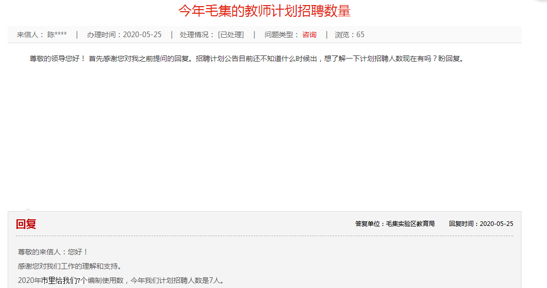 尊敬的來信人:您好!感謝您對我們工作的理解和支持。2020年市里給我們7個編制使用數(shù),今年我們計劃招聘人數(shù)是7人。