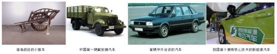 淮海戰(zhàn)役的小推車;中國(guó)第一輛解放牌汽車; 首輛中外合資的汽車; 我國(guó)首個(gè)擁有核心技術(shù)的新能源汽車。看到這四幅圖片你想到了什么?